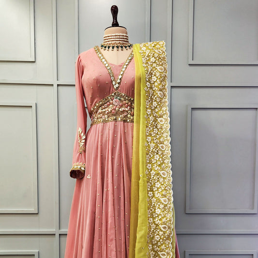 Pink Anarkali with Lime Green Dupatta Floor Length