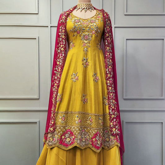 Mustard Embroidered Silk Kurta with Plazo with Mehroon Dupatta Floor Length