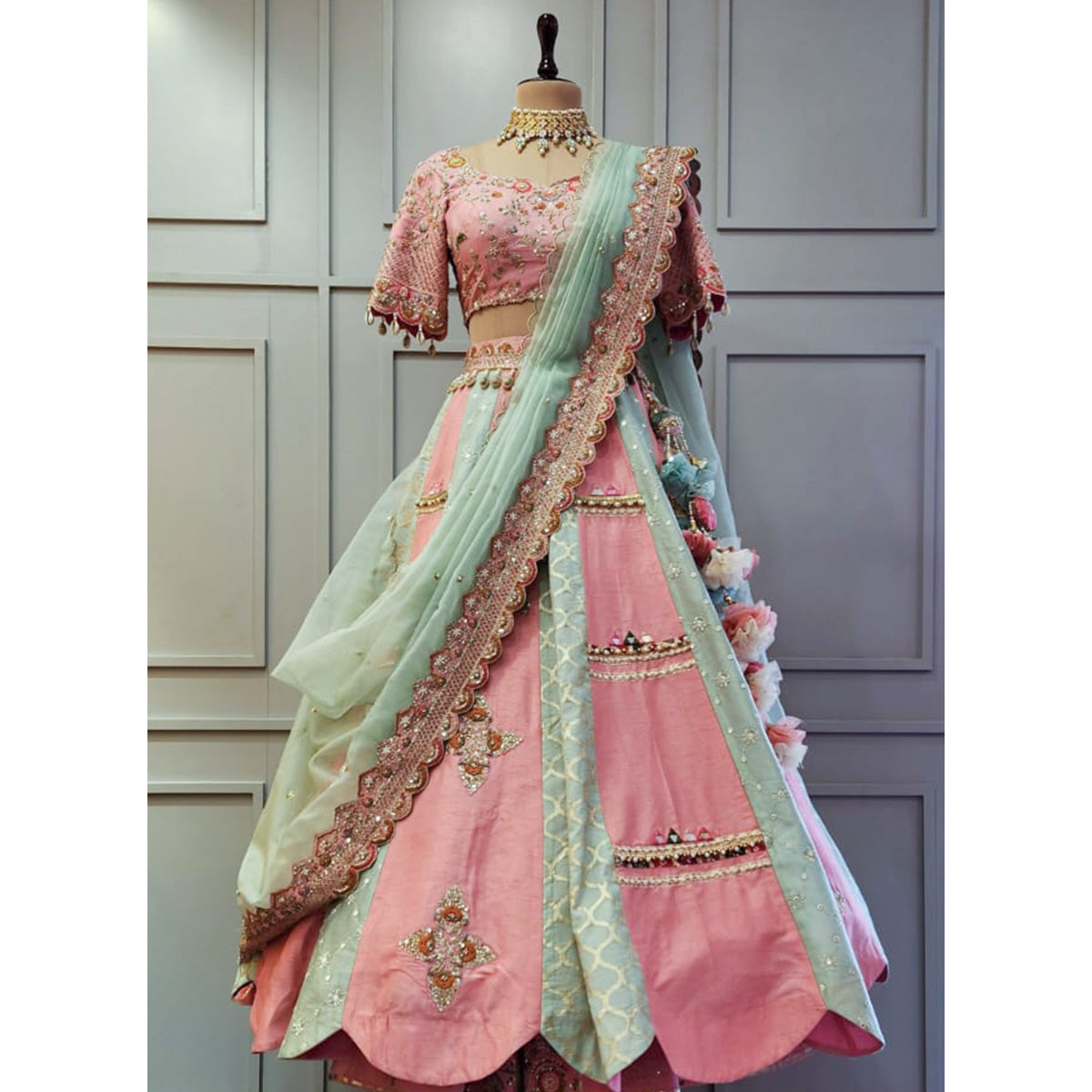 Mint and Baby Pink Panneled Raw Silk Lehenga